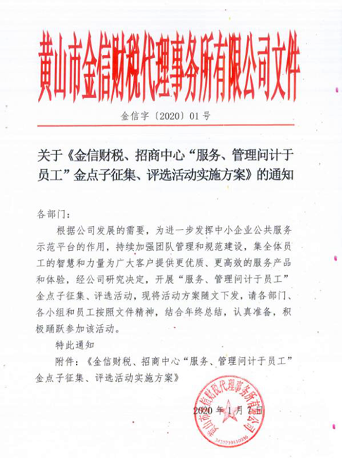 為進一步發(fā)揮“國家中小企業(yè)公共服務示范平臺”的作用,持續(xù)加強團隊管理和規(guī)范建設,集全體員工的智慧和力量為廣大客戶提供更優(yōu)質(zhì)、更高效的服務產(chǎn)品和體驗,招商中心、金信財稅決定開展“服務、管理問計于員工”金點子征集、評選活動。
