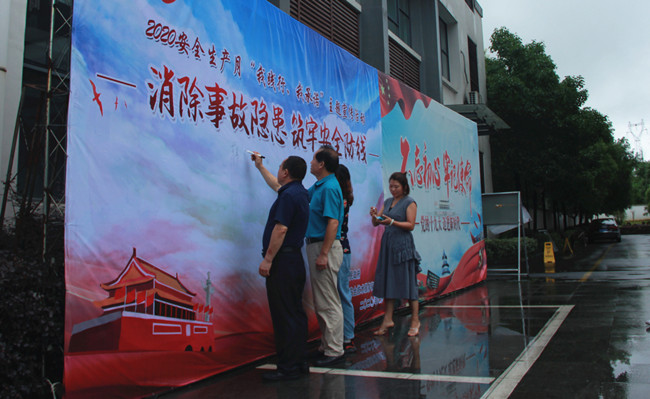(上圖為企業負責人在“消除事故隱患,筑牢安全防線”安全生產月主題噴繪上鄭重簽字。)