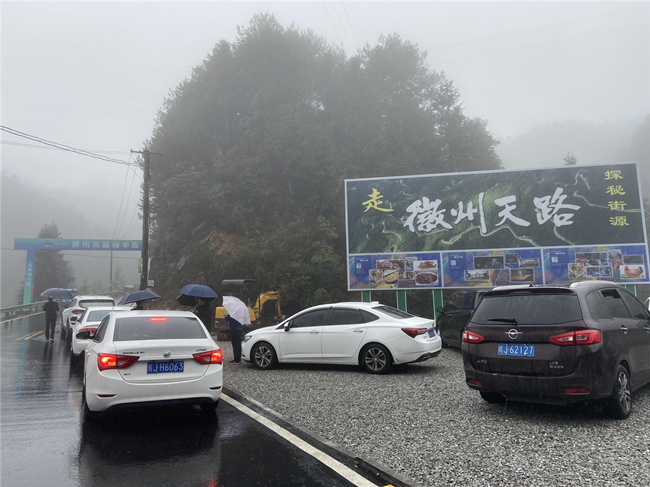 上午10點,抵達徽州天路海拔最高處的大峰尖山頂,天路名不虛傳,加之細雨綿綿,呈現出云霧繚繞,樹木、山峰若隱若現的情景,宛如瓊瑤仙境,員工們都不由得拿出手機,記錄沿途的神奇、美麗的風景。