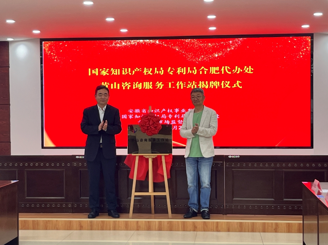 揭牌儀式上,孫雄軍宣讀省知識產權事業發展中心《關于同意設立國家知識產權局專利局合肥代辦處黃山咨詢服務工作站的批復》皖知中[2025]9號,丁濤主任宣布黃山咨詢服務工作站開通辦理業務。最后,出席活動的丁濤主任和黃劍局長共同揭開國家知識產權局專利局合肥代辦處黃山咨詢服務工作站站牌,標志著國家知識產權局專利局合肥代辦處黃山咨詢服務工作站正式運營。